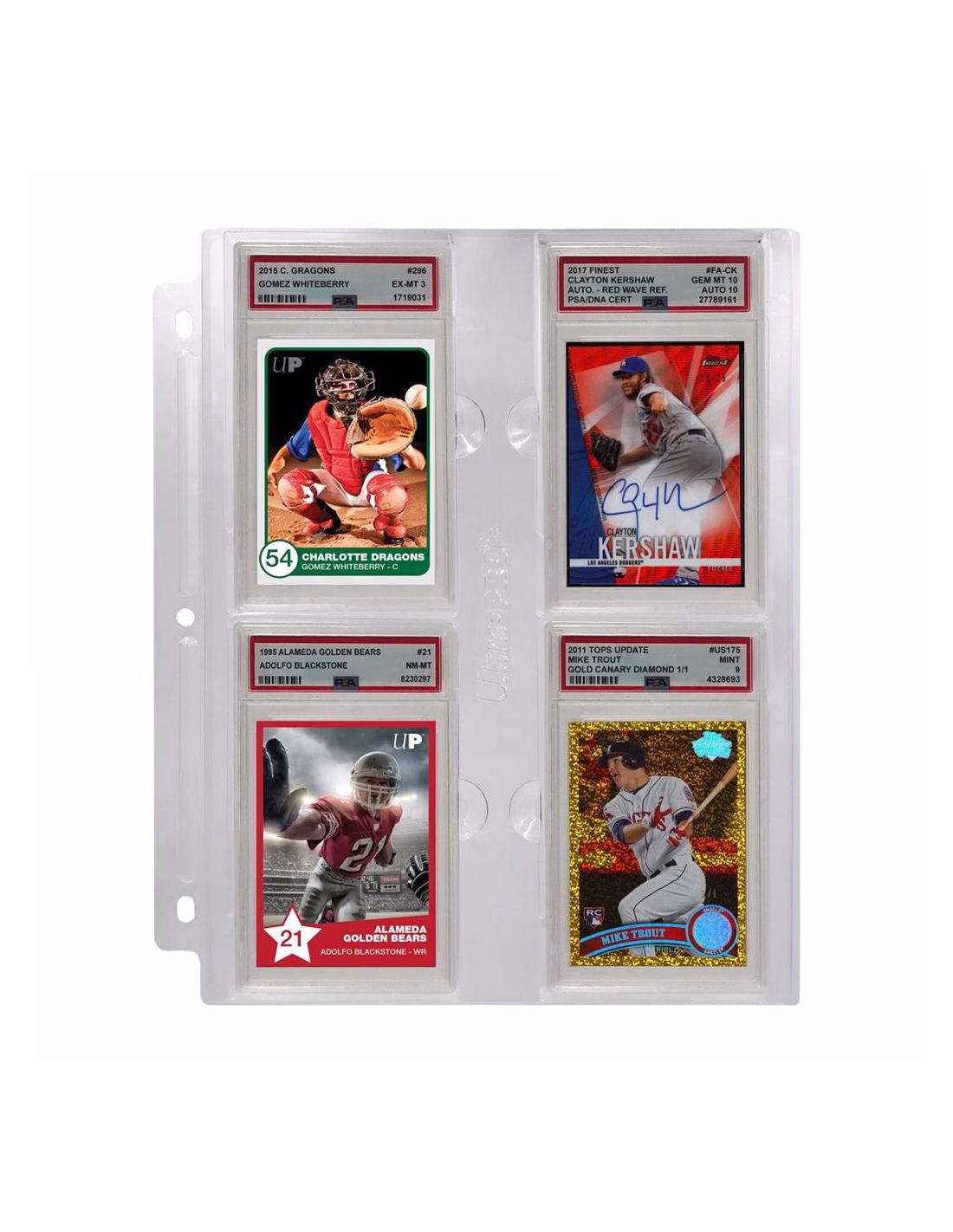 This page is designed to hold 4 PSA graded slabs in a rigid, 3-hole punched page.