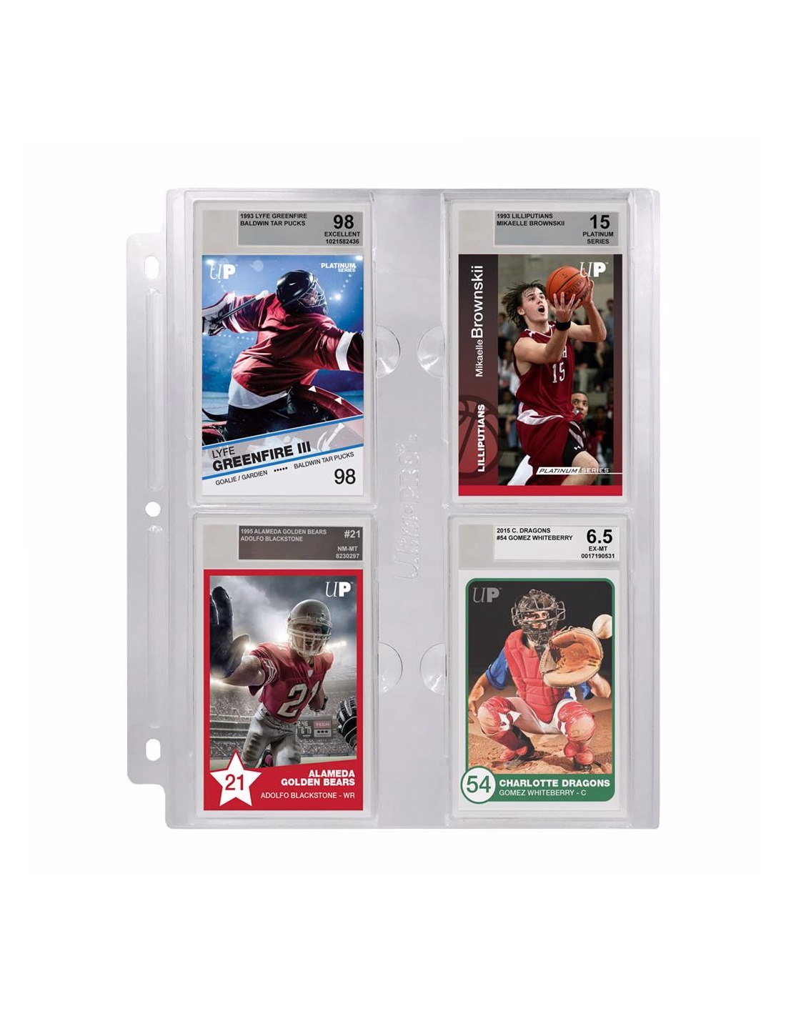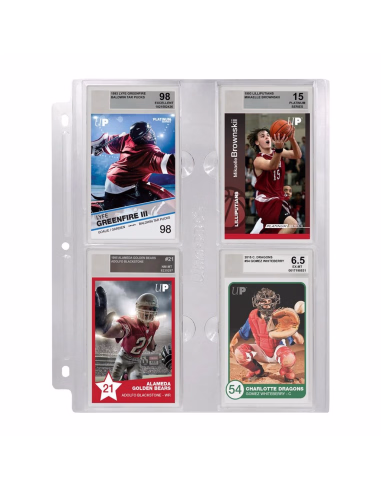 The Graded Slab Page is the perfect way to store, organize and easily view your graded card slabs in an Ultra PRO 3-ring album. This page is designed to hold 4 Beckett graded slabs in a rigid, 3-hole punched page. This page features special lock-in tabs and finger notches to easily remove and reorganize slabs. These pages are a great way to show off your collection or easily carry to conventions and signings.