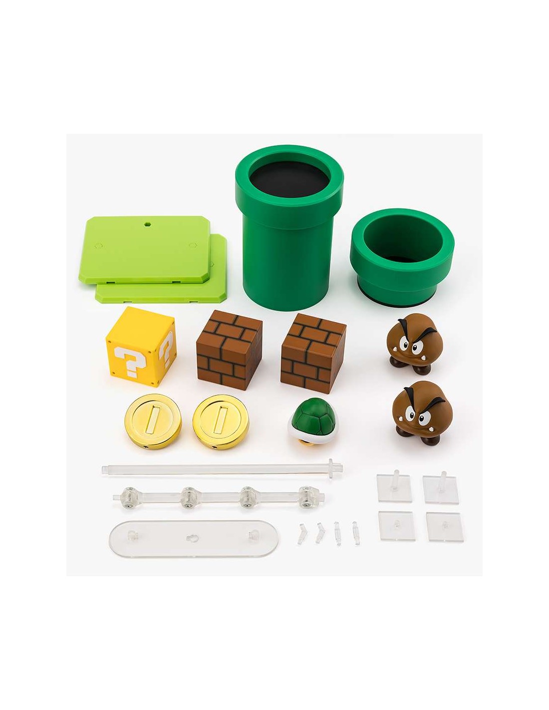 Crafted from high-quality ABS and PVC materials, the playset includes essential scenic elements such as classic brick blocks, question mark blocks containing power-ups, golden coins with dedicated stands, and the unmistakable green pipes that connect different levels of the Mushroom Kingdom. The inclusion of enemy characters like Goomba adds dynamism to your displays.