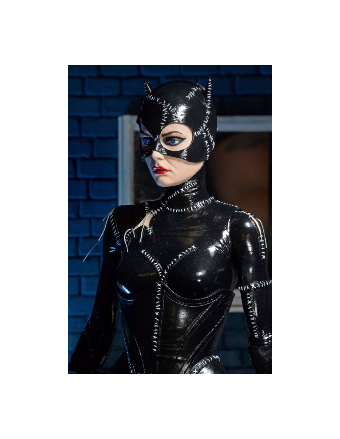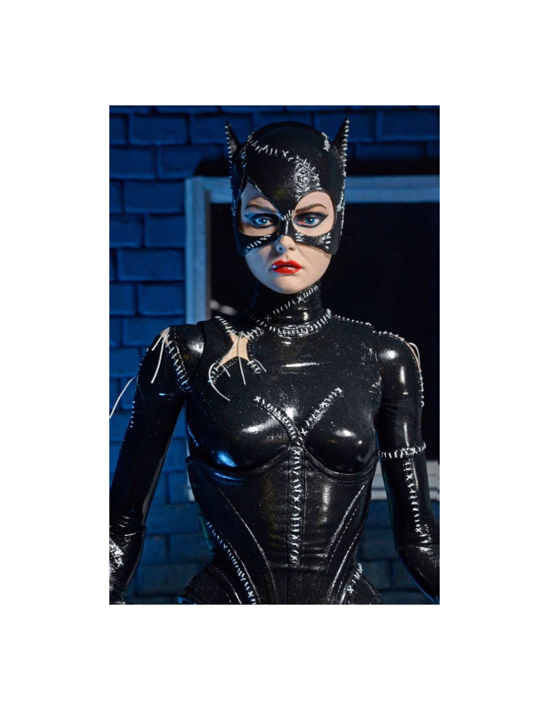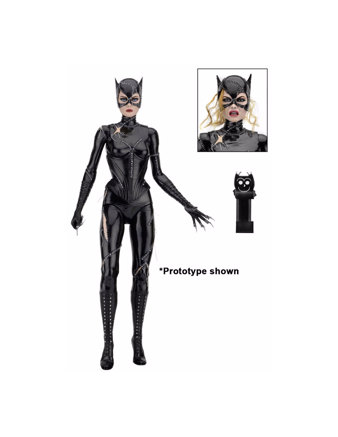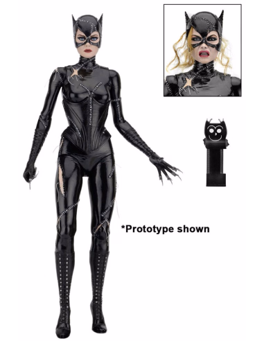 Catwoman comes with two interchangeable heads (one calm; one angry, with synthetic hair escaping from a battle damaged mask) and interchangeable hands, plus Taser and whip accessories.