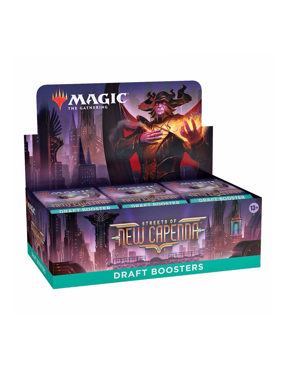 The Streets of New Capenna Draft Booster Box contains 36 Streets of New Capenna Draft Boosters. Draft Boosters are specifically designed for the best Magic: The Gathering booster draft play experience. Each pack contains 15 Magic cards and 1 token, ad card, or counter punchout card, with a combination of 1 card of rarity Rare or higher and 3 Uncommon, 10 Common, and 1 Land cards. A traditional foil card of any rarity replaces a Common in 33% of Streets of New Capenna Draft Boosters. Traditional foil Borderless Mythic Planeswalker in <1% of boosters.