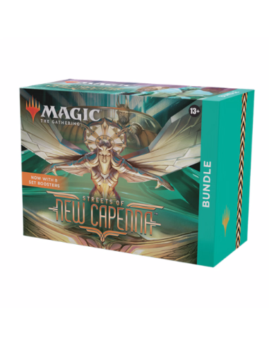 The Streets of New Capenna Bundle contains 8 Streets of New Capenna Set Boosters-the best boosters to open just for fun-plus exclusive accessories, with 40 basic lands (20 traditional foils and 20 nonfoils), 1 traditional foil promo card with Bundle-exclusive alternate art, 1 oversized Spindown life counter, 1 card storage box, and 2 reference cards.