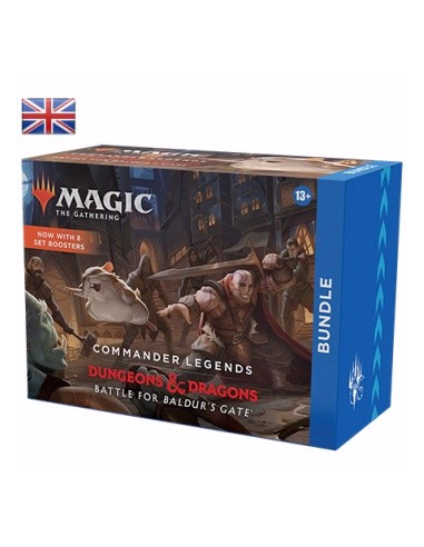 Commander Legends meets D&D in this exciting crossover set! The Commander Legends: Battle for Baldur’s Gate Bundle contains 8 Commander Legends: Battle for Baldur’s Gate Set Boosters—the best boosters to open just for fun—plus exclusive accessories, with 40 basic lands (20 traditional foils and 20 nonfoils), 1 traditional foil promo card with Bundle-exclusive alternate art, 1 oversized Spindown life counter, 1 card storage box, and 2 reference cards.