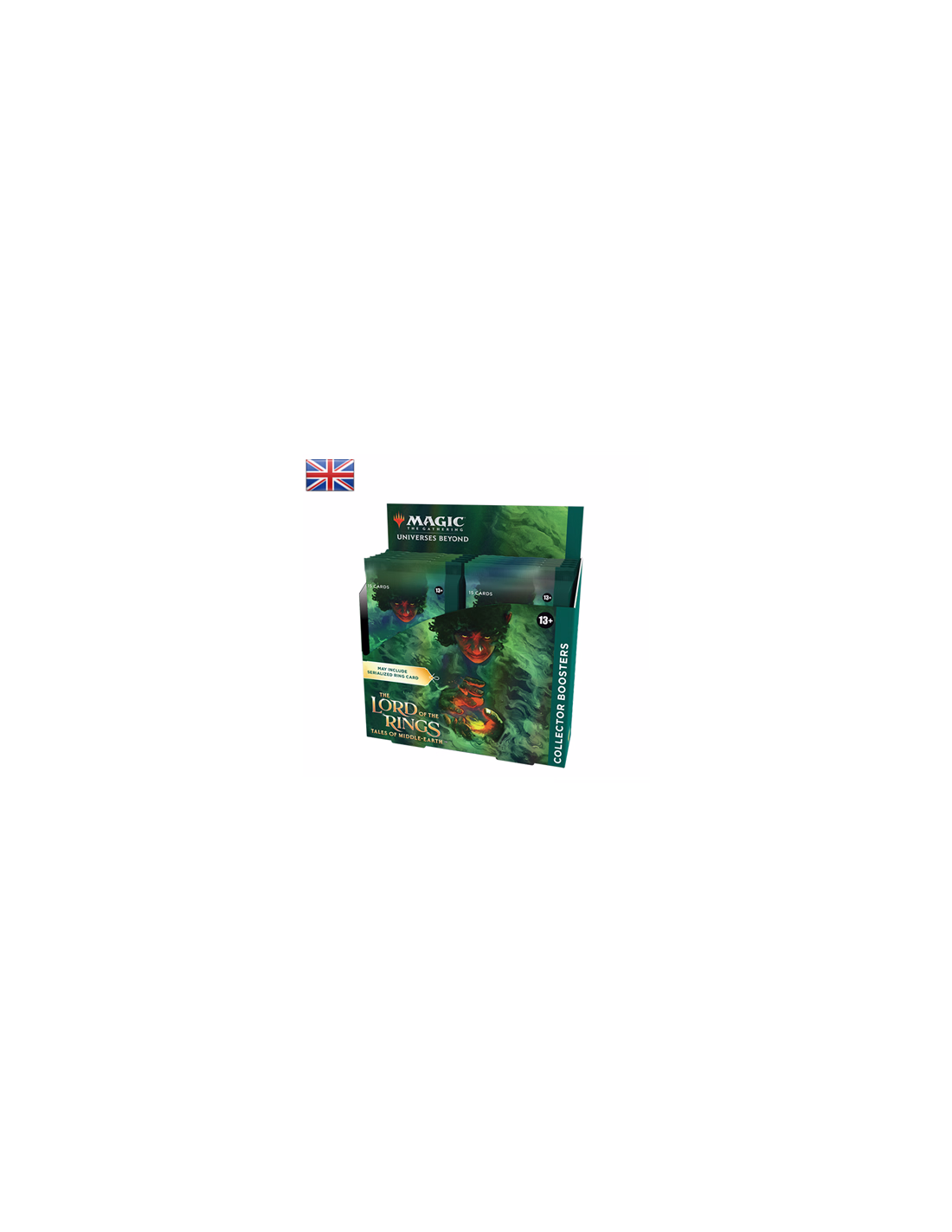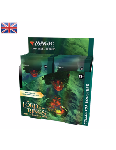 The Lord of the Rings: Tales of Middle-earth Collector Booster Box contains 12 The Lord of the Rings: Tales of Middle-earth Collector Boosters and 1 Traditional Foil Box Topper card. Each Collector Booster contains 15 Magic: The Gathering cards and 1 Traditional Foil double-sided token, with a combination of 5–7 cards of rarity Rare or higher and 3–5 Uncommon, 3–6 Common, and 1 Land cards. Every pack contains a total of 8–10 Traditional Foil cards.