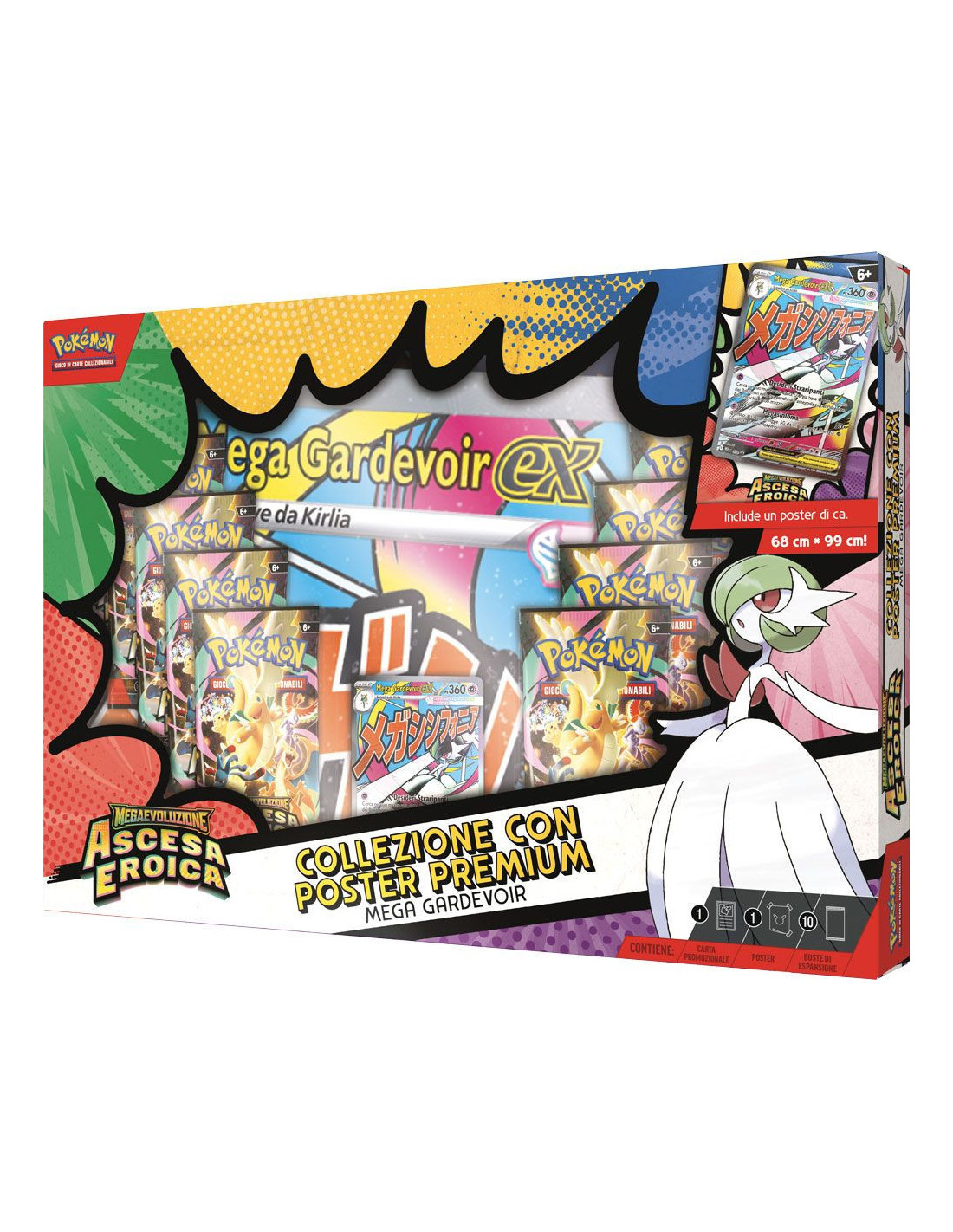 The collection also comes with 10 booster packs from the Mega Evolution — Ascended Heroes expansion, which features over 290 cards including 13 Mega Evolution Pokémon ex, Trainer's Pokémon ex, and Stellar Tera Pokémon ex, all inspired by the Pokémon Legends: Z-A video game. The large double-sided poster — approximately 68 x 99 cm — showcases Mega Gardevoir alongside other Pokémon from the expansion and is ready to display.