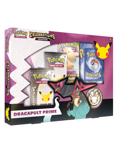 Diving at supersonic speeds, Dragapult swoops into your collection as an impressive Pokémon Prime! This powerful collection includes Pokémon TCG: Celebrations boosters as well as Dragapult Prime and its ghostly stealth—can you strike at just the right moment? If so, dig just a touch deeper and you’ll find additional surprises including a binder and more!