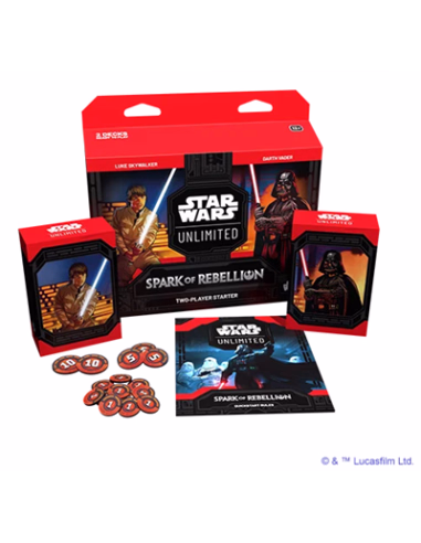 In the Two-Player Starter for the game’s first set, Spark of Rebellion, you will find two fully-built, ready-to-play decks for you and a friend to dive in and start learning the game. Shield your allies as Luke Skywalker or go on the offensive as Darth Vader!