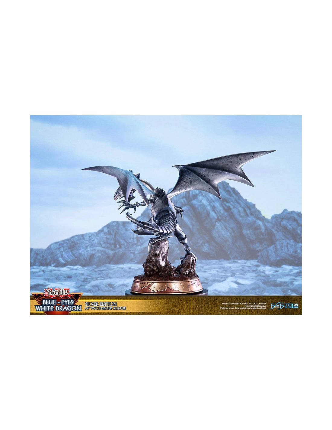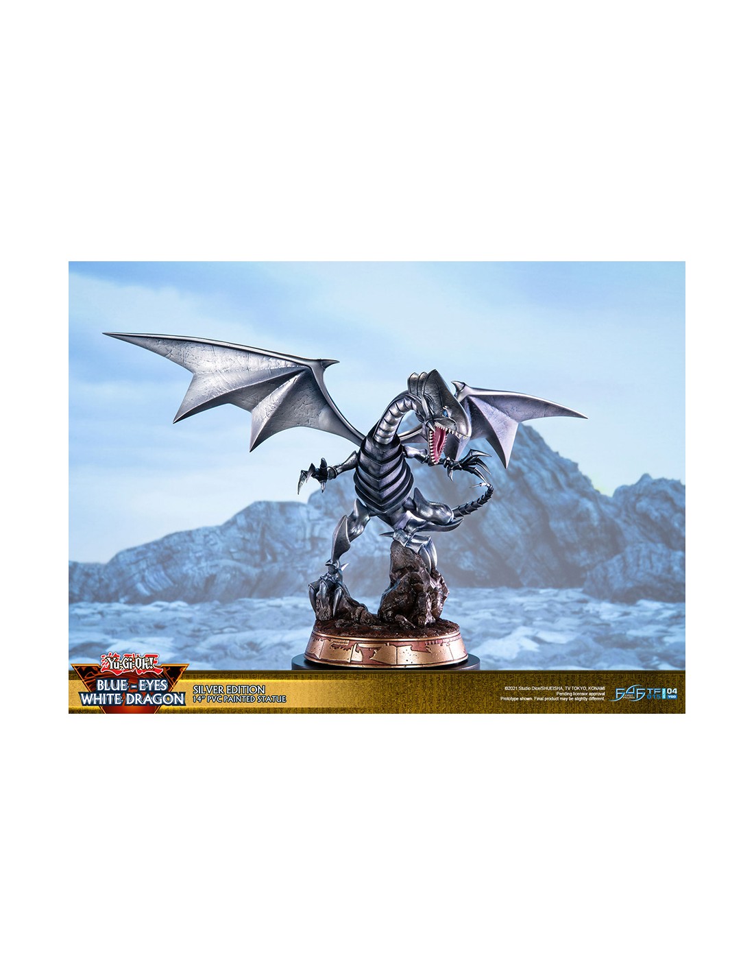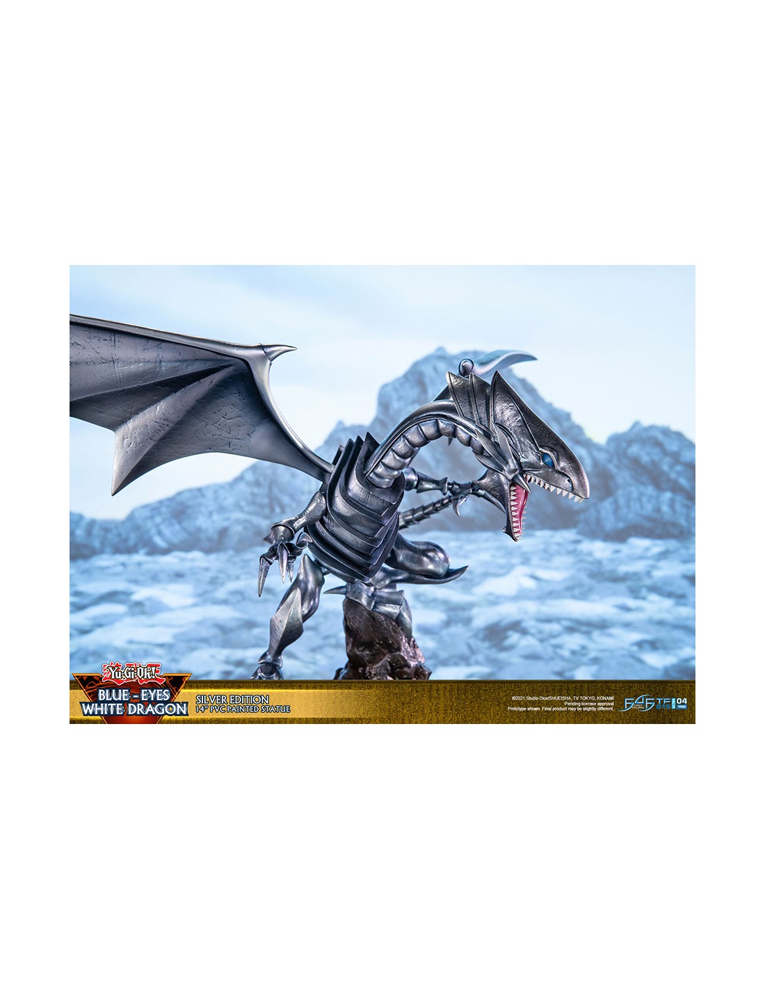 This 14-inch PVC statue depicts the legendary Blue-Eyes White Dragon, the most iconic monster from the Yu-Gi-Oh! franchise and Seto Kaiba's signature card. Manufactured by First 4 Figures, the Silver Edition features a distinctive blackish-blue paint application that gives the dragon a more realistic and mature appearance compared to the classic white variant.