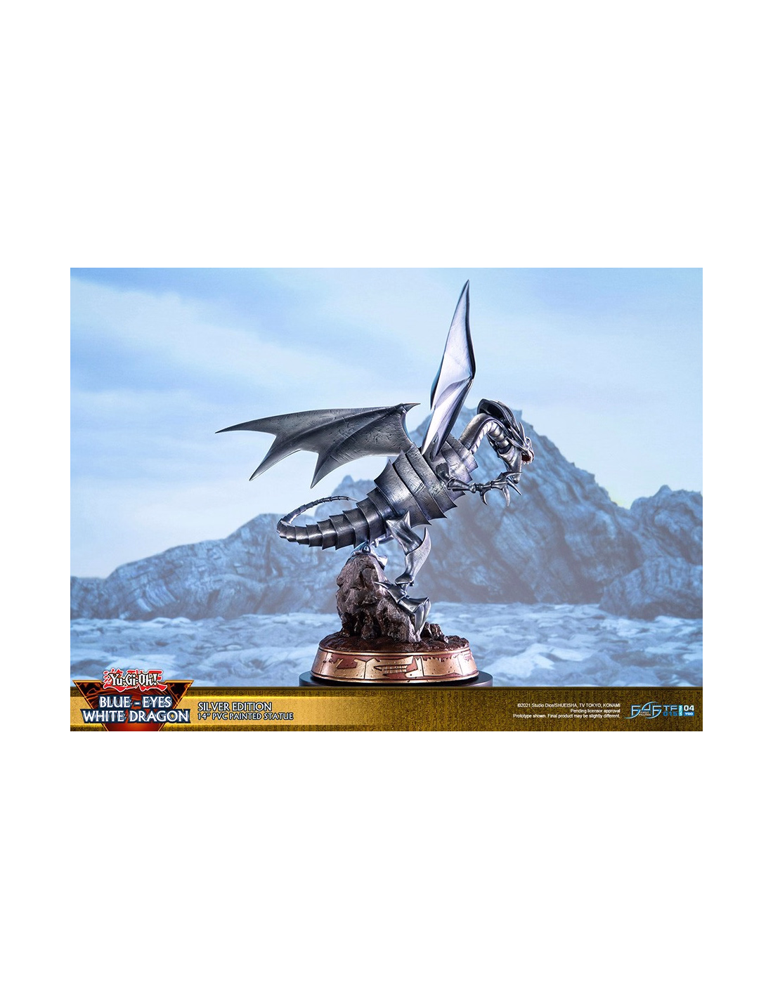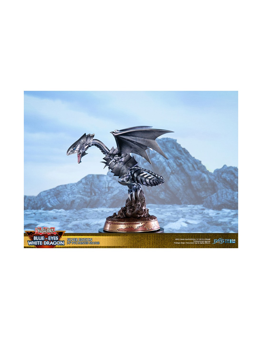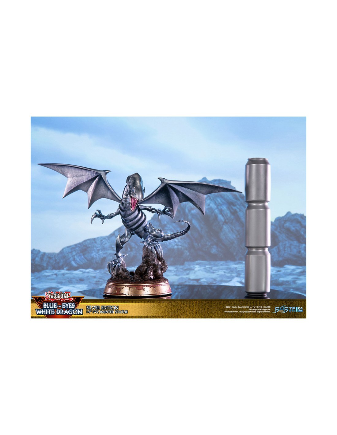 This 14-inch PVC statue depicts the legendary Blue-Eyes White Dragon, the most iconic monster from the Yu-Gi-Oh! franchise and Seto Kaiba's signature card. Manufactured by First 4 Figures, the Silver Edition features a distinctive blackish-blue paint application that gives the dragon a more realistic and mature appearance compared to the classic white variant.