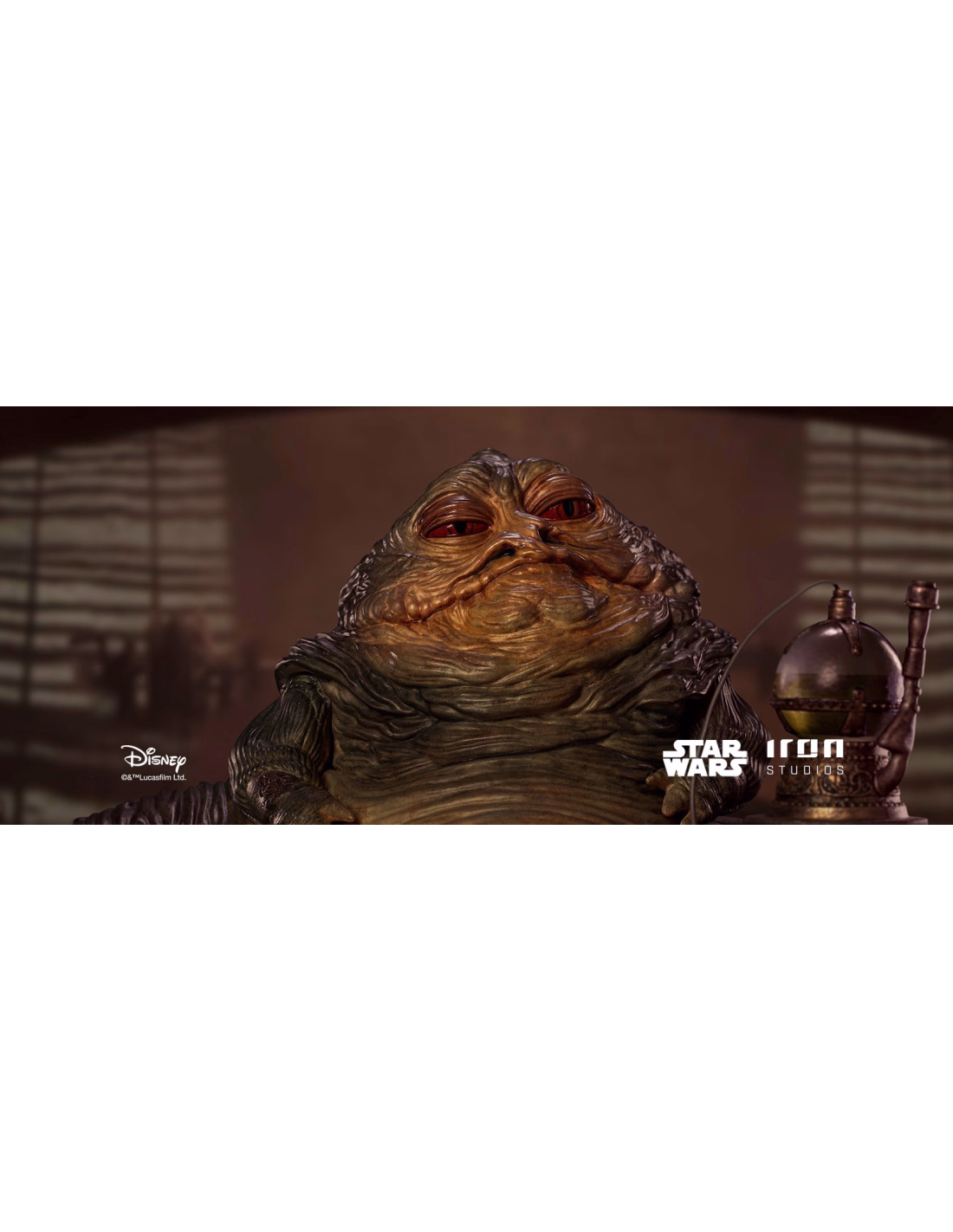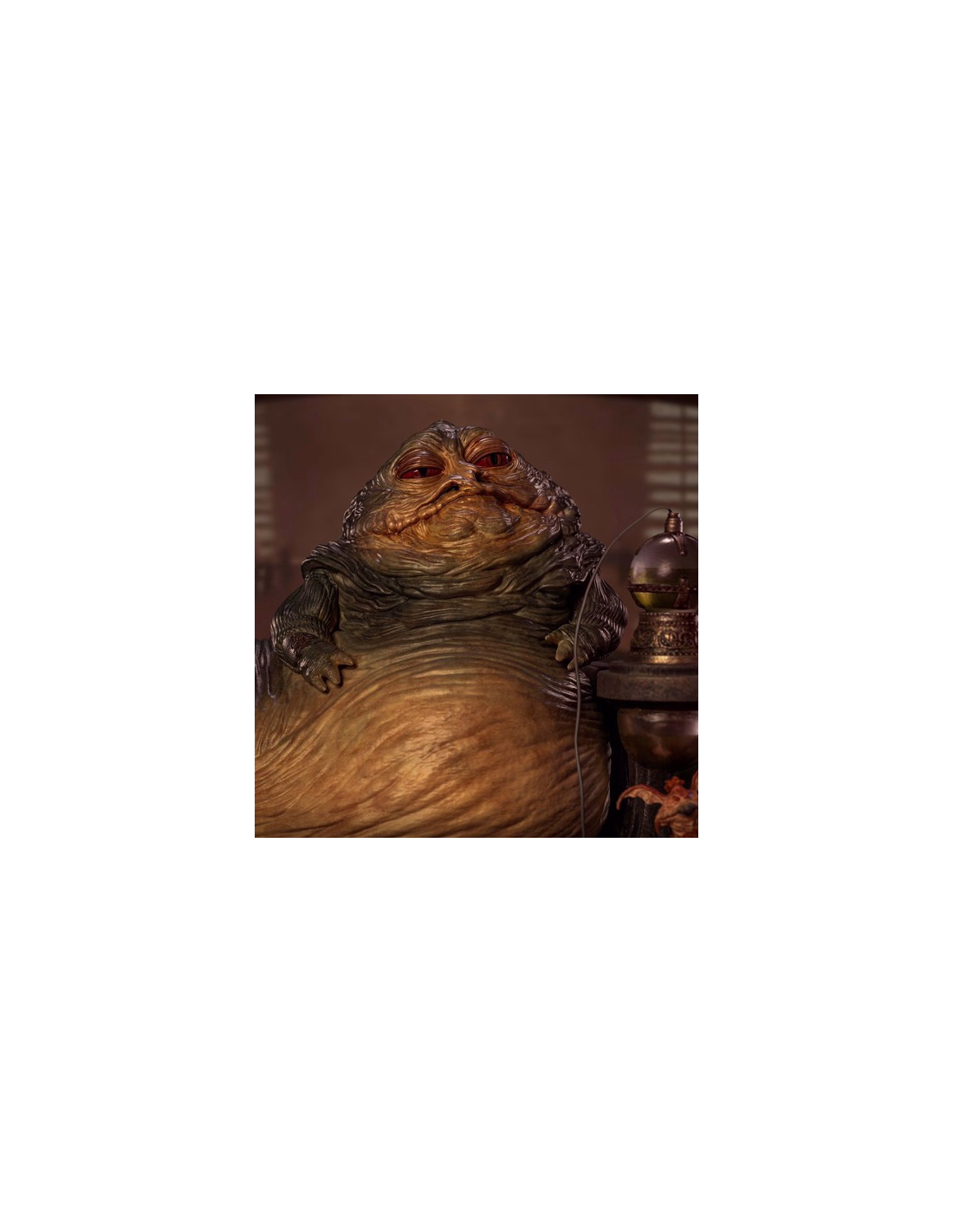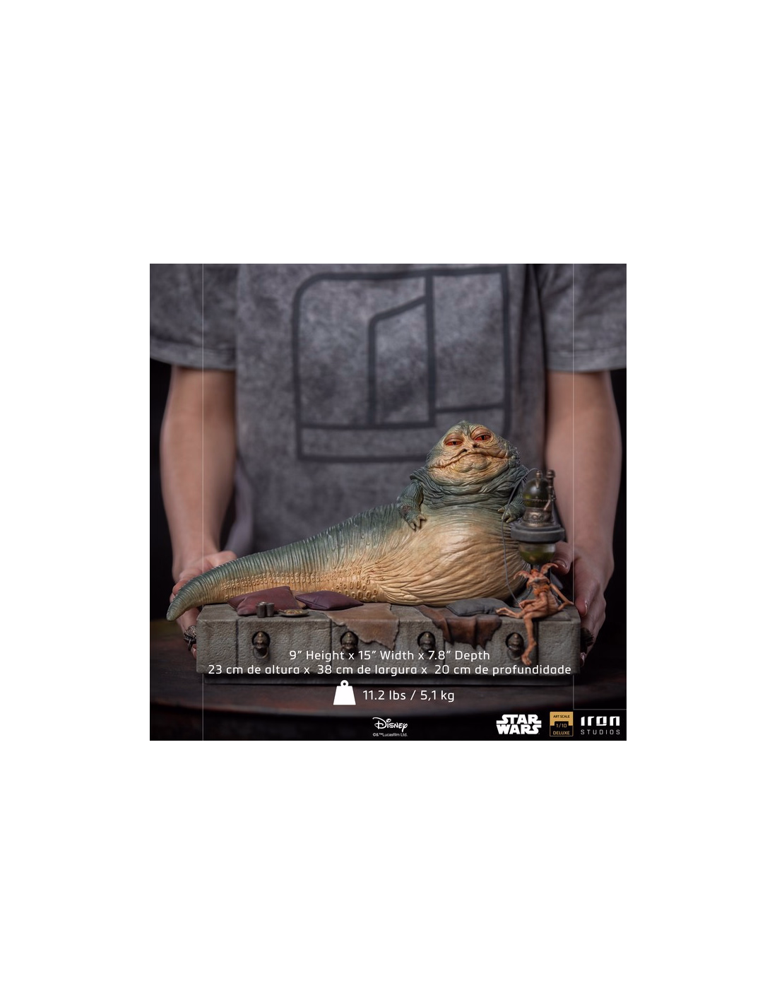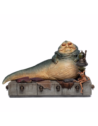With his cruel eyes, the unscrupulous lord of crime judges his victims and watches his henchmen, resting his grotesque and greasy body on his throne, which is shaped like a concrete platform. His throne is surrounded by adornments in the form of bronze cyclopes, which have rings between their teeth to chain their slaves. The crime lord sits between fur cushions with a rustic hookah beside him, for his smoking pleasure, next to his mascot, and court jester, Salacious B. Crumb, a creature known as the Kowakian lizard monkey. In this way, Iron Studios presents its statue"Jabba The Hutt Deluxe Art Scale 1/10 - Star Wars - Iron Studios", with the monstrous villain replicated as in his appearance in the sixth episode of the saga in theaters in "Star Wars: Return of the Jedi "from 1983.