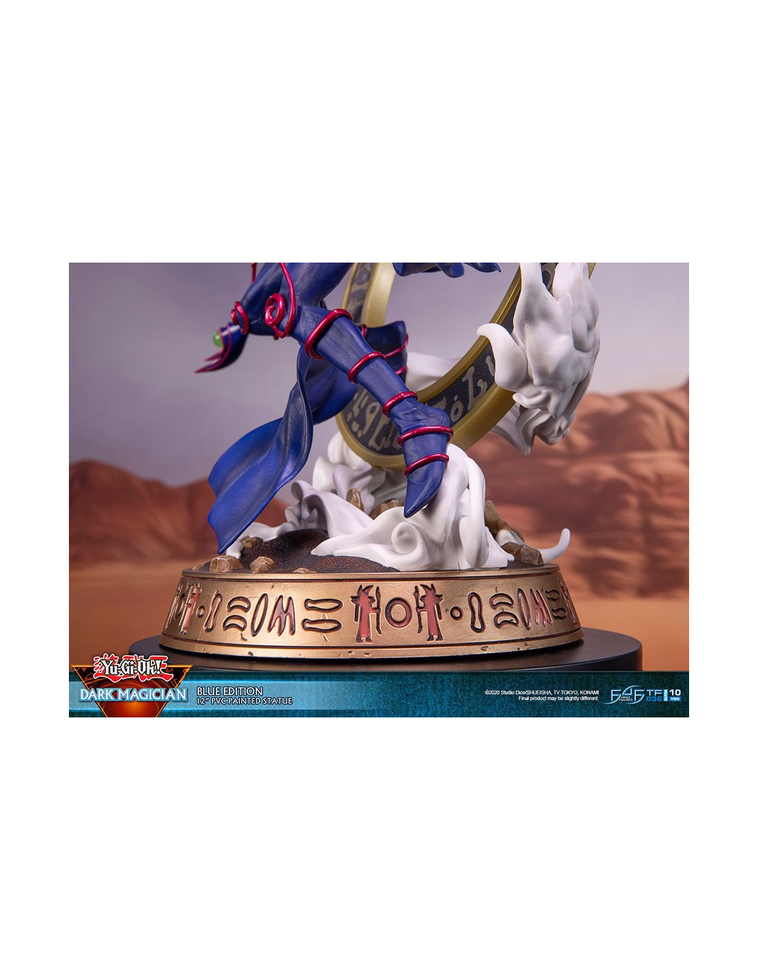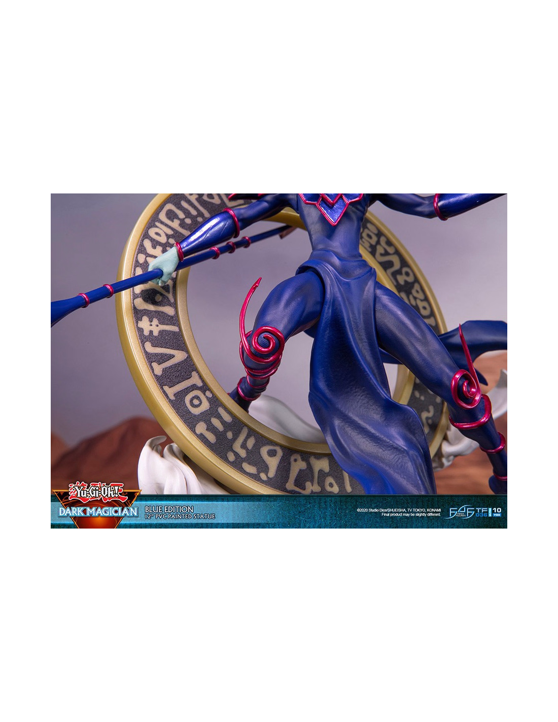 The statue's concept is inspired by one of Dark Magician's iconic summoning poses in the anime, where he's in this "ready for action" stance with the Dark Magical Circle in the background. He has his left arm stretched out and is wielding the Magician's Rod in his right hand, ready to cast his signature spell: Dark Magic Attack.